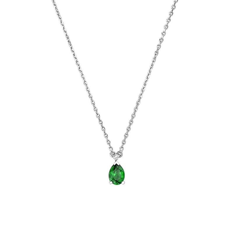 Découvrez cet élégant collier en or blanc rhodié 750/1000 (18K) dévoilant une émeraude taillée en poire et sertie trois griffes pour un poids total de 0,75 carat. Il est surmonté d'un solitaire diamant taillé en brillant et serti trois griffes également pour un poids total de 0,03 carat et est de couleur H et de pureté SI1. Le motif central mesure 10 mm de haut et 5 mm de large. La chaîne forçat ronde qui l'accompagne mesure 42 cm. Son fermoir est de type fermoir mousqueton. Enfin, comptez un poids d'or moyen de 2,95 grammes.