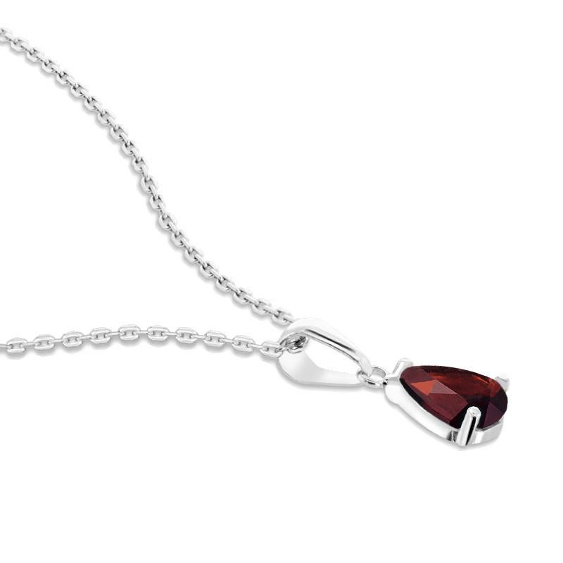 Cette pierre rouge a un poids de 0,66 carat et est de forme poire. Elle a été serti à griffes pour plus de sécurité et a comme dimensions 5 x 7 mm. Concernant le poids de ce bijou : la chaîne a un poids individuel de 1,16 gramme et le pendentif lui 0,26 gramme ce qui offre un poids total de 1,42 gramme.