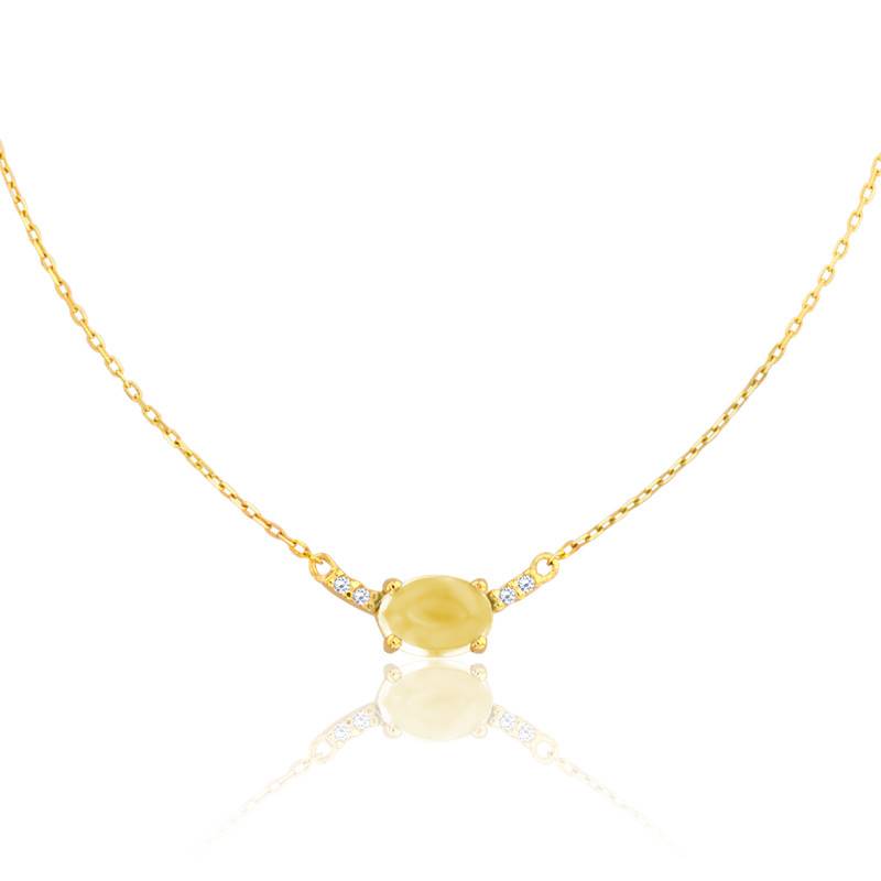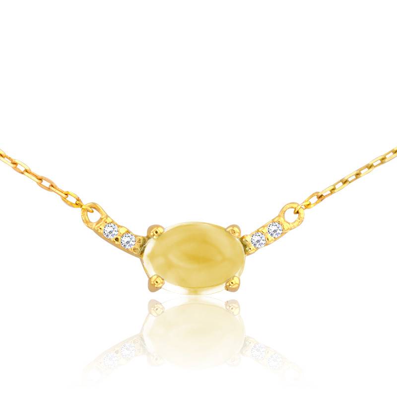 Ravissant collier en or jaune 750/1000 (18K) composé d'une citrine taillée en forme de cabochon et sertie quatre griffes mesurant 4 x 6 mm soit 0,75 carat. La pierre fine est accompagnée de deux diamants sertis à grains de chaque côté.