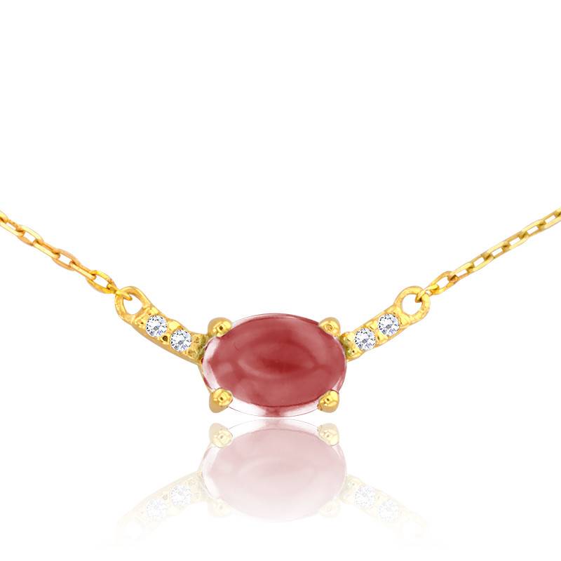 Ravissant collier en or jaune 375/1000 (9K) composé d'un grenat taillé en forme de cabochon et serti quatre griffes mesurant 4 x 6 mm. La pierre fine est accompagnée de deux diamants sertis à grains de chaque côté.