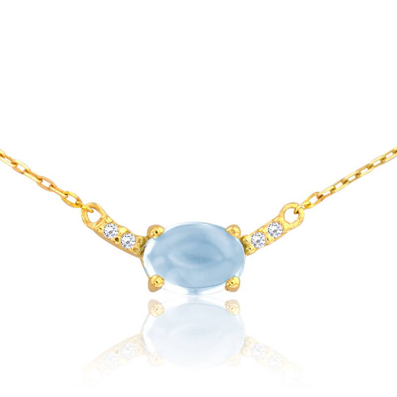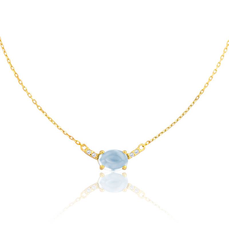 Ravissant collier en or jaune 375/1000 (9K) composé d'une topaze bleue taillée en forme de cabochon et sertie quatre griffes mesurant 4 x 6 mm. La pierre fine est accompagnée de deux diamants sertis à grains de chaque côté.