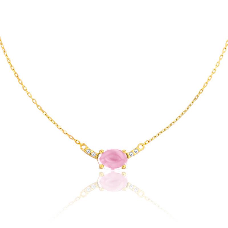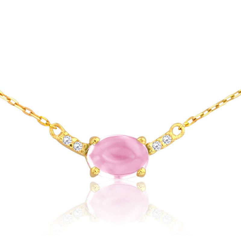 Ravissant collier en or jaune 375/1000 (9K) composé d'une tourmaline taillée en forme de cabochon et sertie quatre griffes mesurant 6 x 4 mm. La pierre fine est accompagnée de deux diamants sertis à grains de chaque côté.