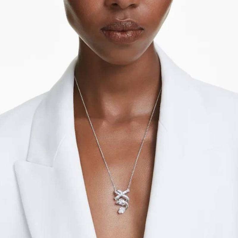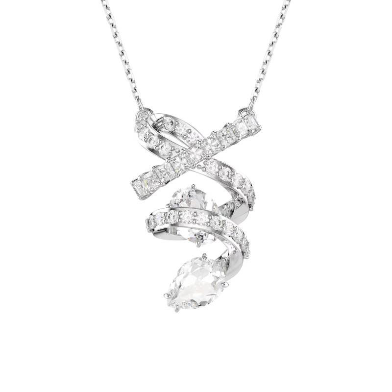 Découvrez ce beau collier de couleur argentée provenant de la collection Hyperbola. Fait en métal rhodié, il est serti à griffes de cristaux de Swarovski blancs arborant différentes tailles. Ces pierres sont placées sur un pendentif en spirale de 1,70 cm de largeur et 2,70 cm de hauteur, lui conférant une allure sophistiquée. Notez que ce bijou s'ajuste sur une longueur allant de 50 à 57 cm et comprend une chaînette d'extension munie d'un cristal. Il est parfait pour parachever une tenue de soirée grâce à son design captivant. Composé d'une chaîne en maille forçat, ce collier dévoile une finition polie pour plus de brillance. Vous pourrez le fermer à l'aide d'un fermoir mousqueton.