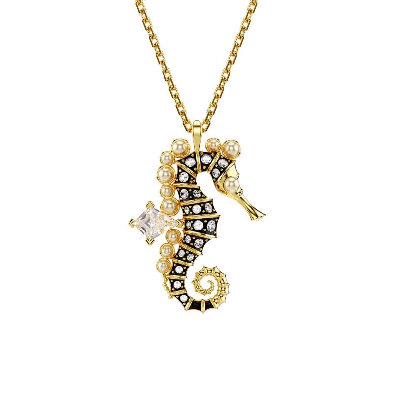 Issue de la collection Idyllia, ce superbe collier saura vous faire resplendir de jour comme de nuit. Fabriqué en métal doré, il se compose d'une chaîne en maille forçat d'une longueur ajustable qui fera un tour parfait de votre cou. Cette dernière s'agrémente d'un pendentif hippocampe vu comme un symbole de force et de pouvoir orné de cristaux blancs et de perles.