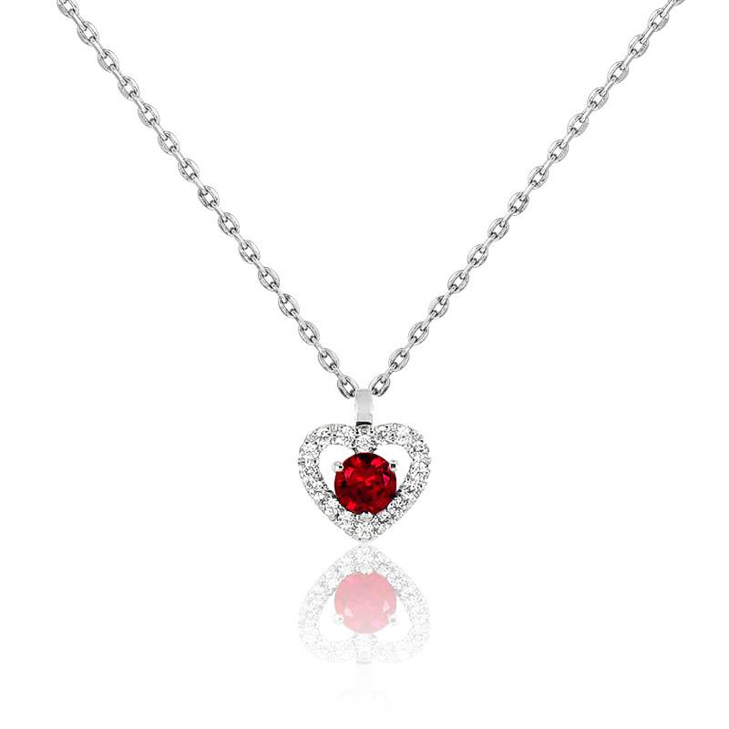 Constitué d'une chaîne forçat ronde en or blanc rhodié 750/1000 (18K), ce collier Mérode affiche une sophistication affirmée. Le pendentif en forme de coeur accompagnant la chaîne se pare d'un rubis central serti trois griffes d'un poids total de 0,18 carat. La pierre précieuse s'entoure d'un pavage de diamants taille brillant, de couleur G et de pureté SI2 d'un poids total de 0,07 carat. Le collier, d'une longueur de 42 cm, possède deux anneaux de réglage et peut être réduit à 40 cm. Il dispose d'un fermoir anneau ressort. Le poids d'or moyen utilisé dans la fabrication de ce collier est de 1,78 g.