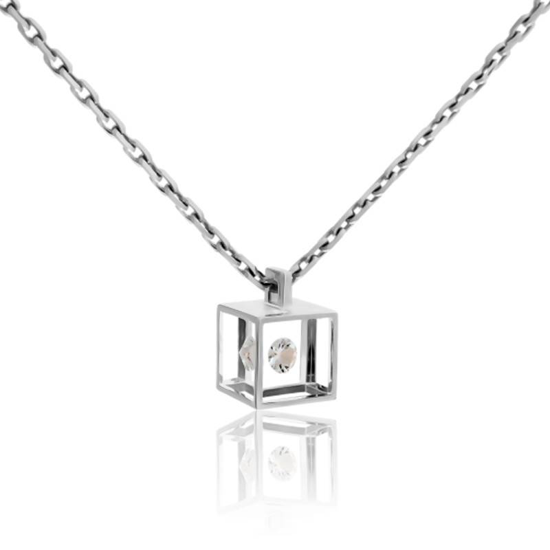 Incontournable, collier en or blanc 750/1000 (18K) enchâsse un diamant dans un cristal de synthèse cultivé en laboratoire en forme de cube, 5.5x5.5x5.5mm. Le diamant taille brillant est ainsi dévoilé dans toute sa transparence, sans artifices, il pèse 0.03 carat et est de qualité G et de pureté SI2. Une parfaite harmonie qui allie une matière contemporaine à un métal immuable et à "la" pierre précieuse. Une idée qui a rendu célèbre Pascal Morabito, artiste et joailler émérite qui a su ravire le coeur de toutes les femmes avec ce concept dit du "Diamant libre". Ce bijou est exposé au musée d'art moderne de New-York.