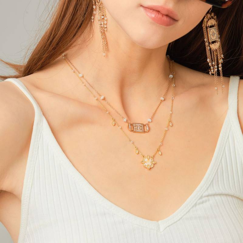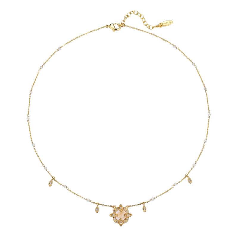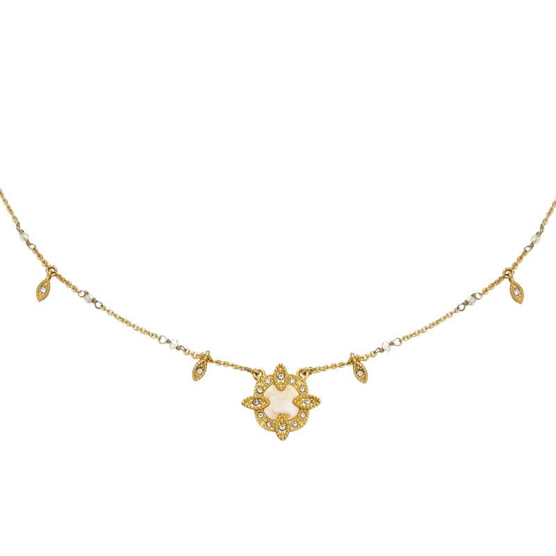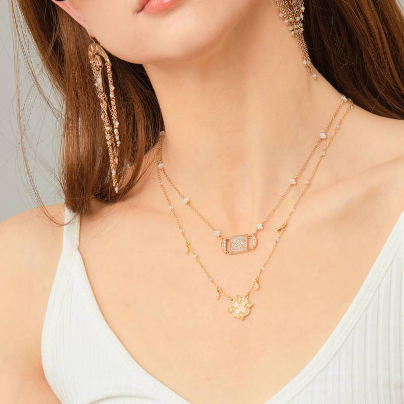 Ce charmant collier Missy arbore une couleur dorée qui lui permet de se marier aisément avec un large choix de tenues. Il est réalisé en laiton doré à l'or fin 14 carats (0,075 microns) et mis en avant par une finition polie. Notez que ce modèle comprend une chaîne en maille jaseron qui s'étend sur une longueur de 45 cm réglable grâce à une chaînette d'extension de 5 cm. Sur cette dernière, sont installées des perles de verre facettées et des pampilles pour un côté plus distingué. Au centre de ce bijou, se trouve un pendentif orné d'une pierre avec un effet ivoire et entouré de strass à effet diamant. Notez que ce collier pour femme se ferme à l'aide d'un fermoir mousqueton facile à manipuler.