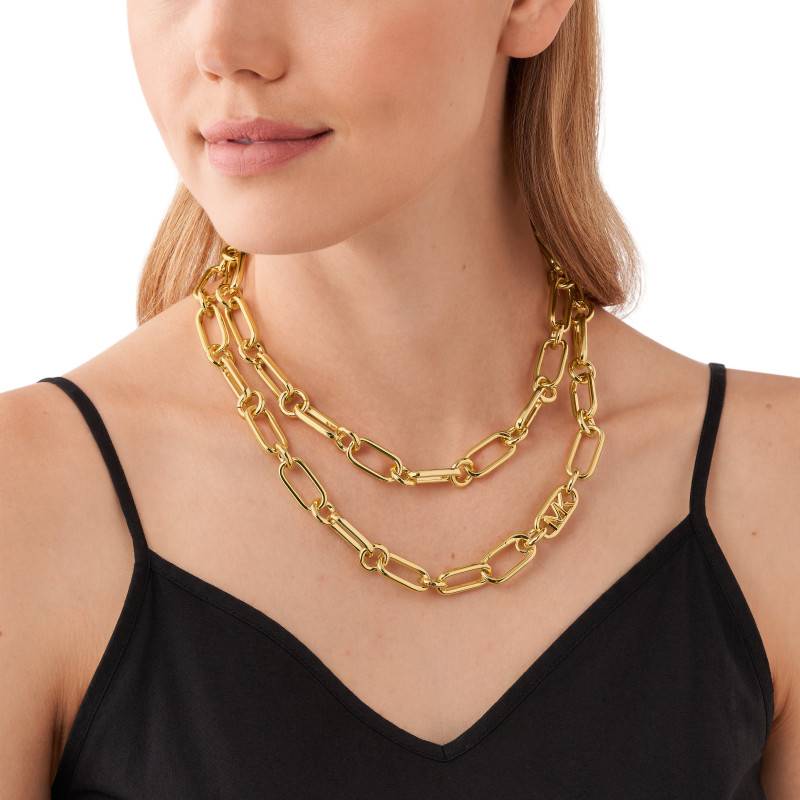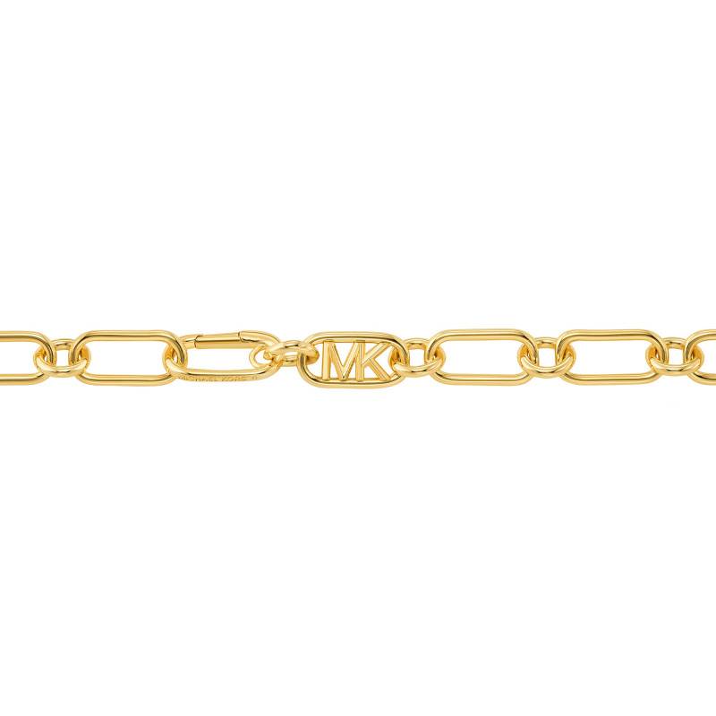 Ce sublime collier de la collection MK Statement Link arbore une couleur dorée qui saura apporter de l'éclat à votre style. Il se constitue d'une grande chaîne en maille fantaisie à la finition polie sur laquelle est visible un maillon comportant les initiales de la marque. Cette dernière est réalisée en laiton plaqué or jaune 585 (14K) et mesure 90 cm de longueur. Pouvant être portée de diverses façons, elle sera la touche finale élégante qui sublimera votre apparence. Vous pourrez maintenir ce collier à votre cou au moyen d'un fermoir mousqueton à clapet.