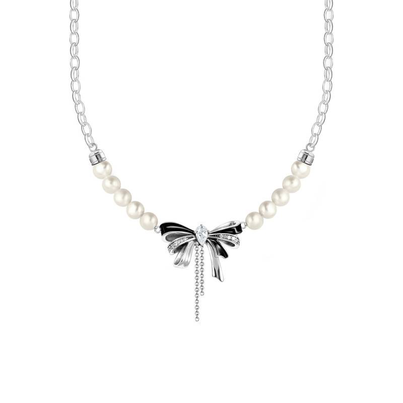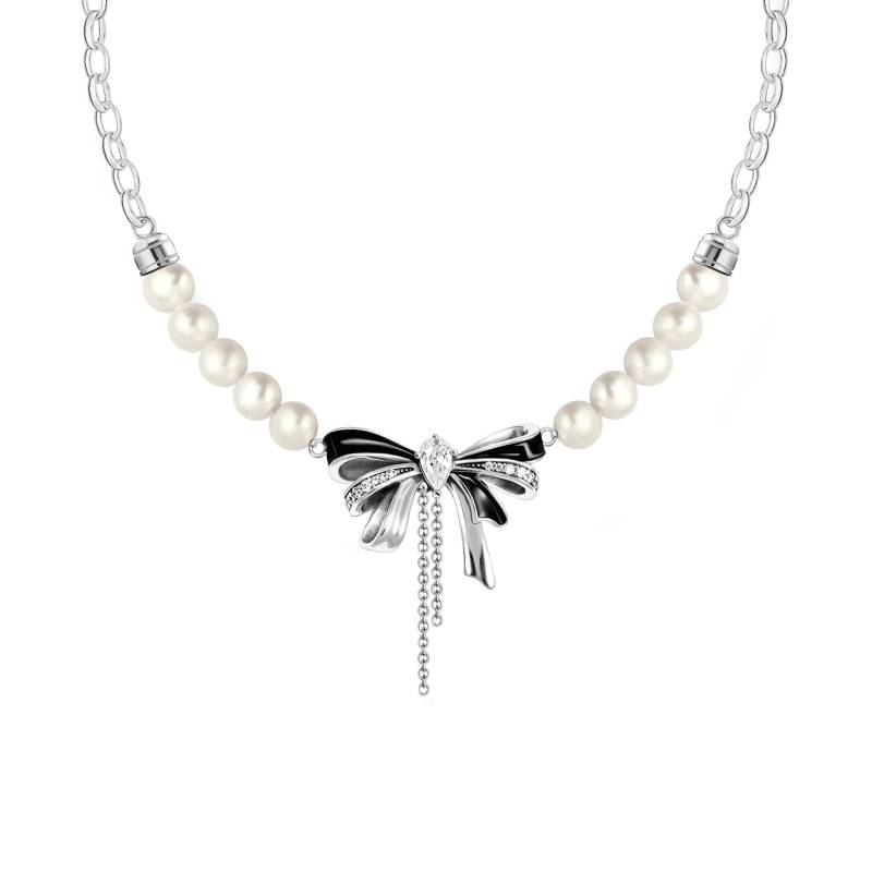 Ce Collier Noeud et Perles est une ode à la féminité délicate. D'une teinte grise raffinée, il se pare d'un pendentif en forme de nœud émaillé de noir, sublimé par des pierres en oxyde de zirconium blanc qui dansent à la lumière, serties sur un argent massif 925/1000 poli et brillant. Les perles de culture ajoutent une touche de douceur et d'élégance à ce bijou exceptionnel. Sa longueur ajustable de 40 à 45 cm et son fermoir mousqueton assurent un port parfaitement adaptable et confortable. Notez que son épaisseur est de 2,50 mm.