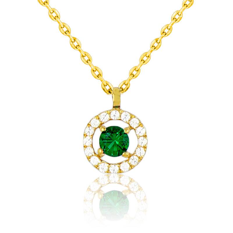Conçu en or jaune rhodié 750/1000 (18K), ce collier de 42 centimètres de longueur est constitué d'une chaîne forçat ronde additionnée à un pendentif rond. Ce pendentif accueille un pavage de 16 diamants taille brillant, de couleur G et de pureté SI2 d'un poids total de 0,06 carat. La pierre centrale est une émeraude sertie quatre griffes de 0,14 carat. La fermeture du collier se fait via un fermoir anneau à ressort tandis que deux anneaux de réglage sont présents pour vous permettre de réduire sa longueur à 40 centimètres. Le poids d'or moyen utilisé dans la conception de ce bijou est de 1,74 g. Enfin, ce joli collier en or jaune 750/1000 (18K) se refermera à l'aide d'un fermoir de type anneau à ressort.