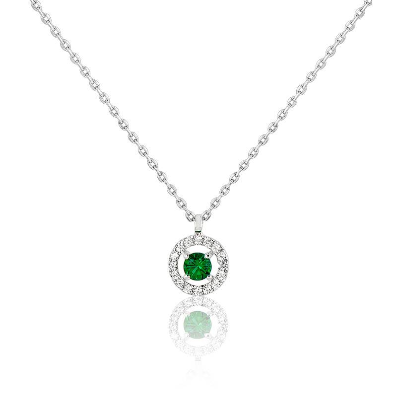 Entre élégance sophistiquée et esprit minimaliste, ce collier Alaverdi de la maison Diamond Lady se compose d'une chaîne forçat ronde en or blanc rhodié 750/1000 (18K) ainsi que d'un pendentif. Ce pendentif de forme ronde est pavé de diamants taille brillant pour un poids total de 0,06 carat tandis que la pierre centrale est une émeraude, sertie quatre griffes, taille brillant de 0,14 carat. Notons que les diamants sont de couleur G et de pureté SI2.