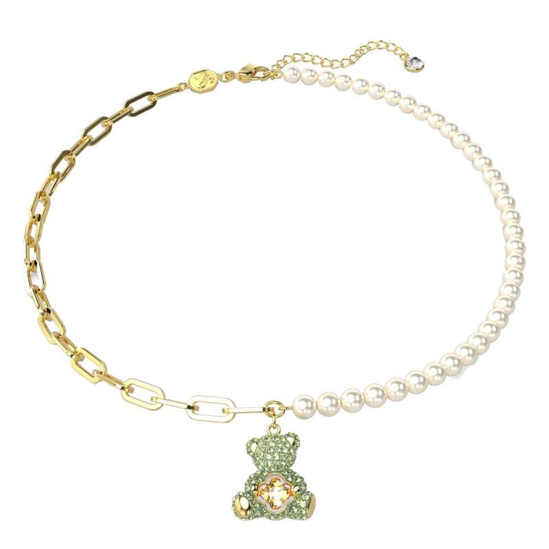 Ce splendide collier Teddy saura vous charmer. Il se pare d'un côté d'une chaîne en métal dorée, et de l'autre de délicates perles blanches. Son design original parera votre cou avec élégance, et sera la touche qui dynamisera votre apparence. Son centre est mis en valeur par un pendentif ours de couleur verte, arborant à l'avant des cristaux ronds et verts. Il a une hauteur de 1,90 cm, et une largeur de 1,60 cm.