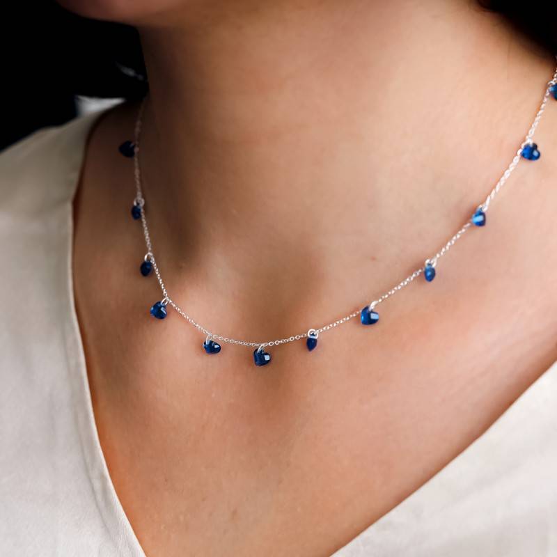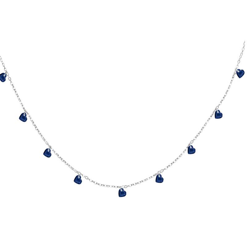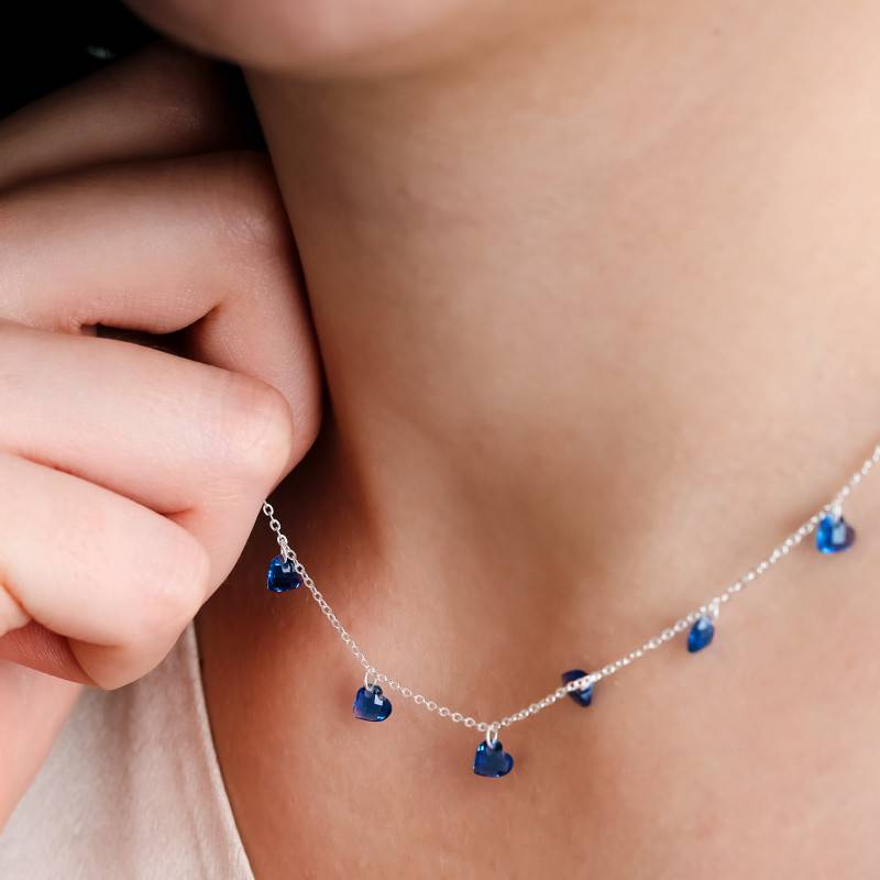 Elle est agrémentée de dix-huit pierres de 4 mm de largeur pour 4,5 mm de longueur. Leur forme cœur est mise en valeur par la couleur bleue, offrant à ce bijou une allure romantique sans en faire trop pour autant. Ajustez votre collier selon vos envies en moyen d'une chaînette d'extension de 5 cm. Son fermoir mousqueton vous permettra de l'attacher avec souplesse sans risque de l'égarer.