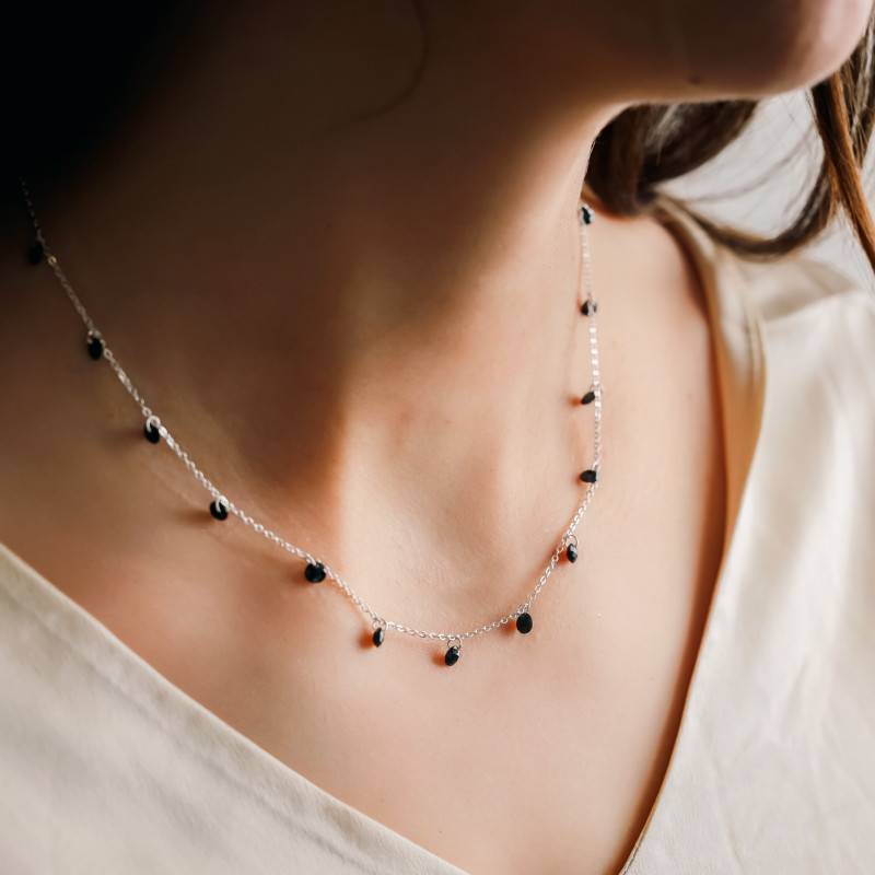 Chacune des 20 pierres mesure 4 mm de diamètre, et se tiennent sur la chaîne comme des pampilles avec des petits anneaux. Alors qu'un fermoir mousqueton permet de maintenir ce bijou sans risque de glisser.