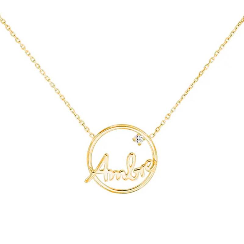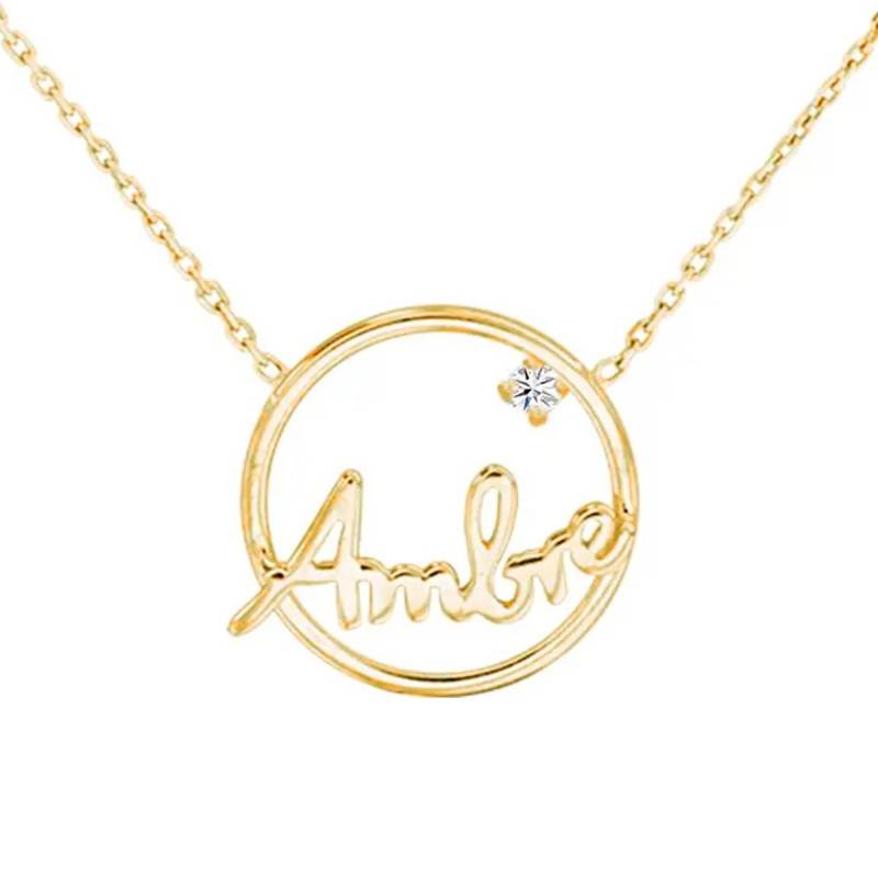 Optez pour ce superbe collier au prénom personnalisable en or jaune 375/1000 (9K). Présenté ici avec le prénom Ambre fixé à un cercle de diamètre 18 mm, sur lequel est placé à l'intérieur un diamant serti à griffes de couleur H et de pureté SI1. Ce collier est muni d'une chaîne maille forçat ronde fine d'une longueur de 42 cm. Le fermoir est de type anneau à ressort. Le poids d'or moyen est de 2,30 g. Ce modèle existe également en or blanc.