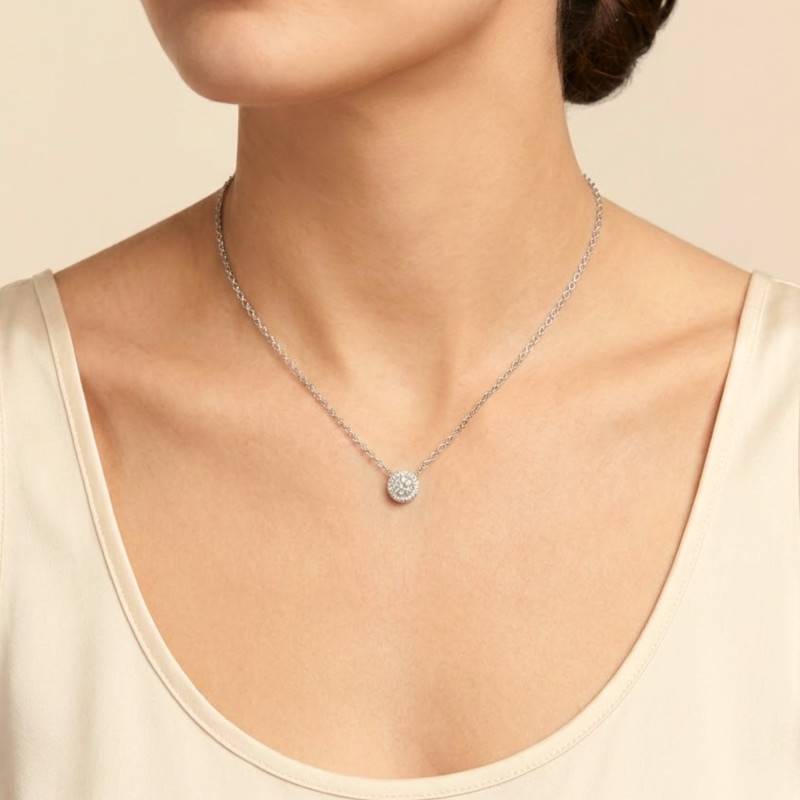 Ocarat vous dévoile ce sublime collier confectionné en or blanc 375/1000 (9K). Il est pourvu d'une chaîne en maille forçat de 1.1 mm de largeur. Ce splendide collier est muni d'un pendentif rond raffiné de 7.5 mm de diamètre qui est mis en valeur par une pierre lumineuse sertie à griffe placée au centre de pierres en oxyde de zirconium. Léger et raffiné, il dispose d'une finition polie et brillante et se ferme grâce à un fermoir mousqueton. Vous pourrez l'ajuster à votre cou entre 41 et 46 cm.
