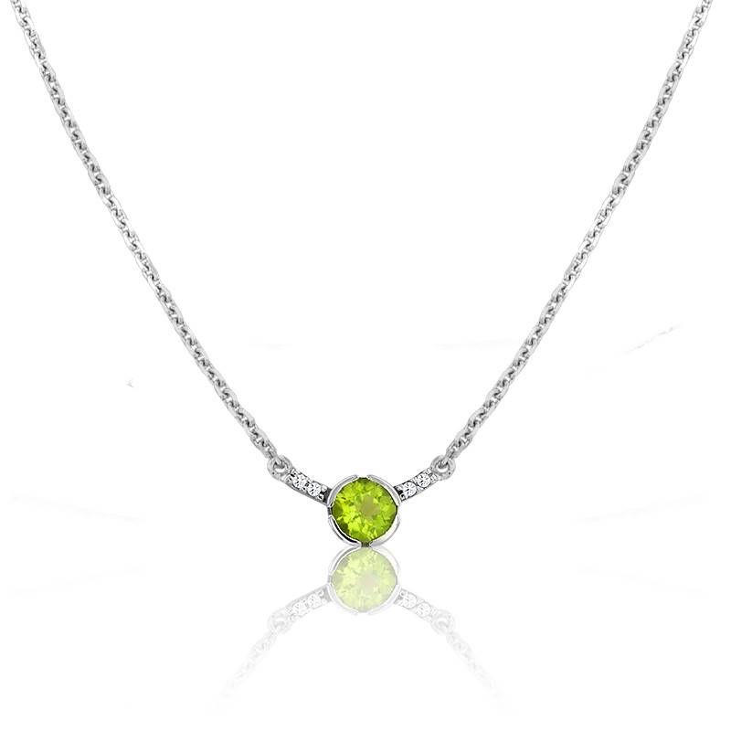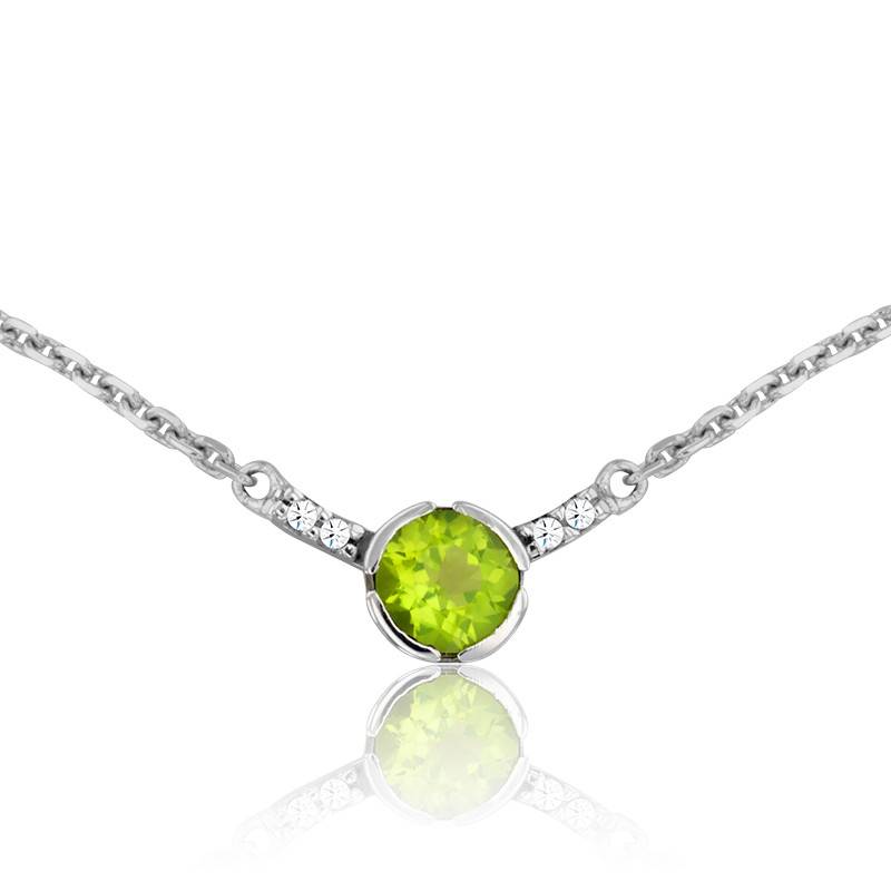 La pierre fine en question est un péridot taillé en brillant, serti semi-clos d'un diamètre de 5 millimètres. Ce péridot s'entoure de deux diamants sertis à grains de chaque côté. Ceux-ci sont taillés en brillant, de couleur H, de pureté SI1 et affiche un poids total de 0,0248 carat.