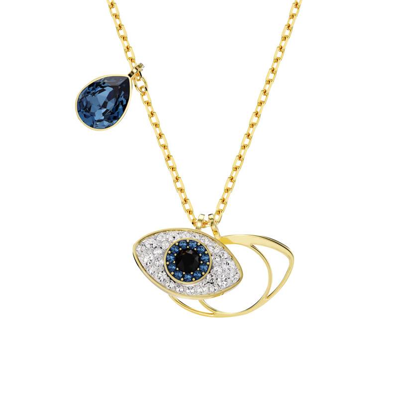 Ce charmant collier émanant de la collection Symbolica. Il est façonné en métal doré et se pare d'une chaîne en maille forçat rectangle. Il est orné de pendants en forme de poire et rond qui sont sertis de cristaux bleus lui accordant une touche captivante. Un pendentif ajouré doré est suspendu, un autre bombé le suit avec un pavage de cristaux tricolores sertis à grains et rappelant l'organe principal visuel, l'oeil. Il symbolise un porte-bonheur assurant une protection contre le mauvais œil et affiche 1,80 x 1,50 cm de dimensions. Il est muni d'un fermoir mousqueton facilitant sa manipulation ainsi que d'une chaînette d'extension permettant d'ajuster sa longueur de 38 à 45 cm.