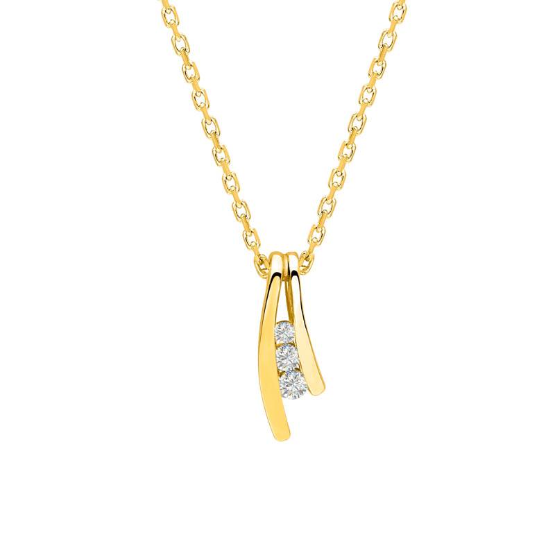Illuminez votre cou par ce merveilleux collier trilogie Fait en or jaune 750/1000 (18K), ce dernier ne manquera aucune occasion pour vous sublimer. Il est monté sur une chaîne en maille forçat d'une longueur de 42 cm qui soulignera votre cou avec souplesse et douceur. Son pendentif est formé par deux brins courbés qui accueillent un trio de diamants blancs de 0,05 carat. Ces pierres étincelantes ajoutent une touche subtile au bijou en rehaussant son éclat. Elles affichent une couleur GH et une pureté P1 et sont taillées dans une forme brillant. Ce collier se pare d'une finition polie, garantissant un effet rayonnant. Sachez que son poids d'or moyen fait 2,25 grammes.