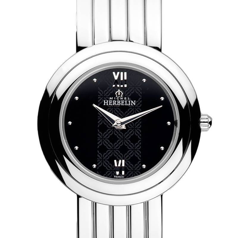 Montre femme de la maison Michel Herbelin, ce modèle embarque un mouvement à quartz suisse Ronda 751 de 4 rubis. La montre offre les fonctions heures et minutes. Le boitier est de forme ronde avec un diamètre de 28,5mm. Il est en acier inoxydable 316L. Cet acier présente de multiples avantages sur plusieurs plans. Sanitaire, puisqu'il est hypoallergénique, et à l'usage, puisqu'il est indéformable, quasi indestructible et nécessite un faible entretien. Le verre est un verre saphir reconnu dans le monde de l'horlogerie pour sa forte résistance aux rayures. Le fond de la boite est emboité.