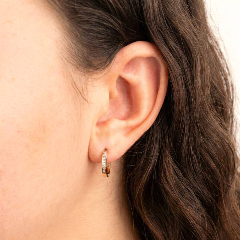 Ces ravissantes créoles sont des créations minimalistes qui se combineront facilement avec toutes les tenues. Dorées, elles sont réalisées en or jaune 750/1000 (18K) et sont mises en avant par une finition polie qui leur accorde une allure brillante. Discrète et intemporelle, chaque boucle dévoile un pavage de pierres précieuses serties rail. Il s'agit de diamants brillants de couleur G et de pureté SI2. Ces boucles d'oreilles illumineront votre visage et vous offriront une note chic et élégante qui rehaussera votre style à merveille. Très tendances, elles sont pourvues de fermoirs russes qui vous faciliteront leur maniement.