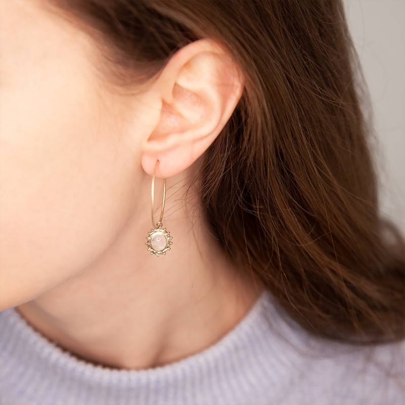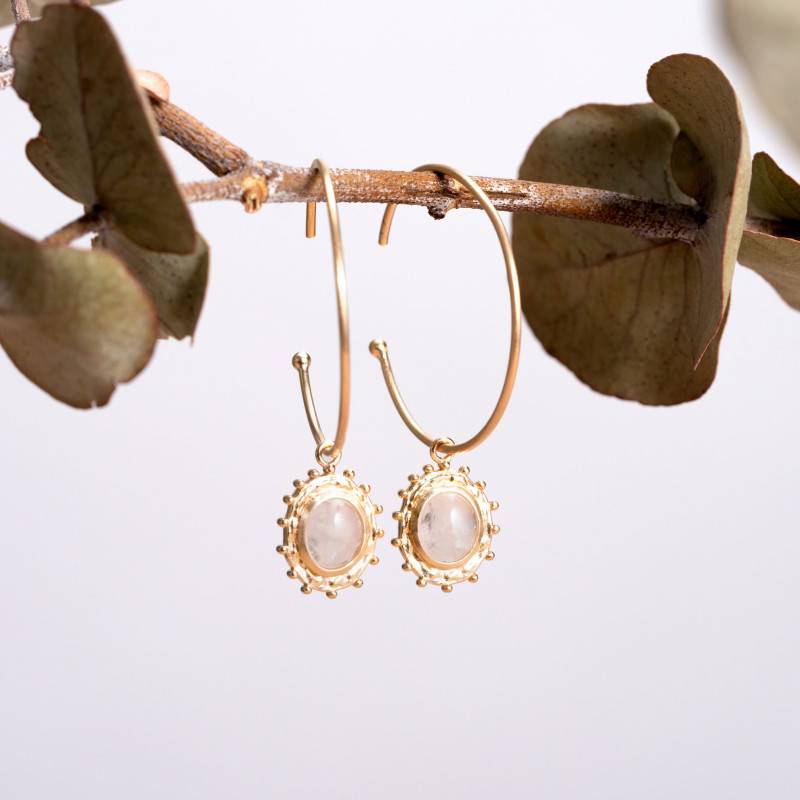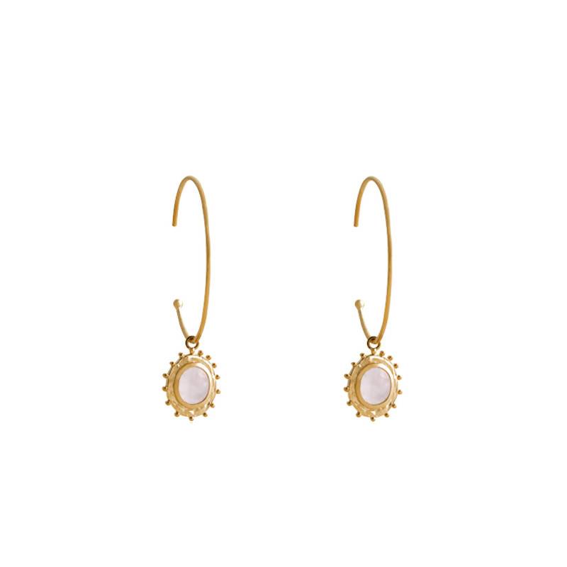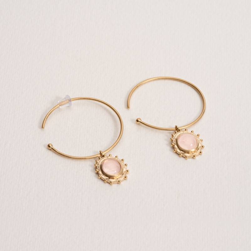 Nous vous dévoilons cette douce paire de créoles issue de la collection Odile, elle est réalisée en plaqué or jaune 3 microns. Ce plaquage permet au bijou de résister à la vie durant de longues années. Cette merveilleuse paire de créoles possède un design original et tendance, accompagnée de composante en quartz rose qui viendra sublimer votre port de tête avec élégance. Elle dispose d'une finition brillante, avec un diamètre de 28 mm. Très original, ce bijou vous donnera à la fois la sensation d'avoir un bijou personnalisé et ajoutera une touche de détails à votre tenue. Moderne et tendance elle sera parfaite comme cadeau à un être cher !