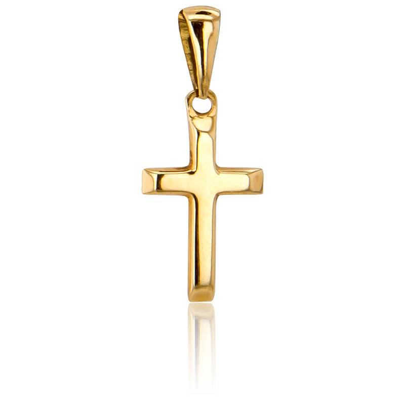 Cette croix en or jaune 750/1000 (18K) présente un corps épais, bombé sur la face avant et fond plat à l'arrière. Avec une finition lisse, sa composition en or jaune offre de jolis reflets en contact avec la lumière. D'une hauteur de 16 mm, elle embarque un poids d'or moyen de 0,43 gramme à la fabrication, pour une épaisseur de 1,10 mm.