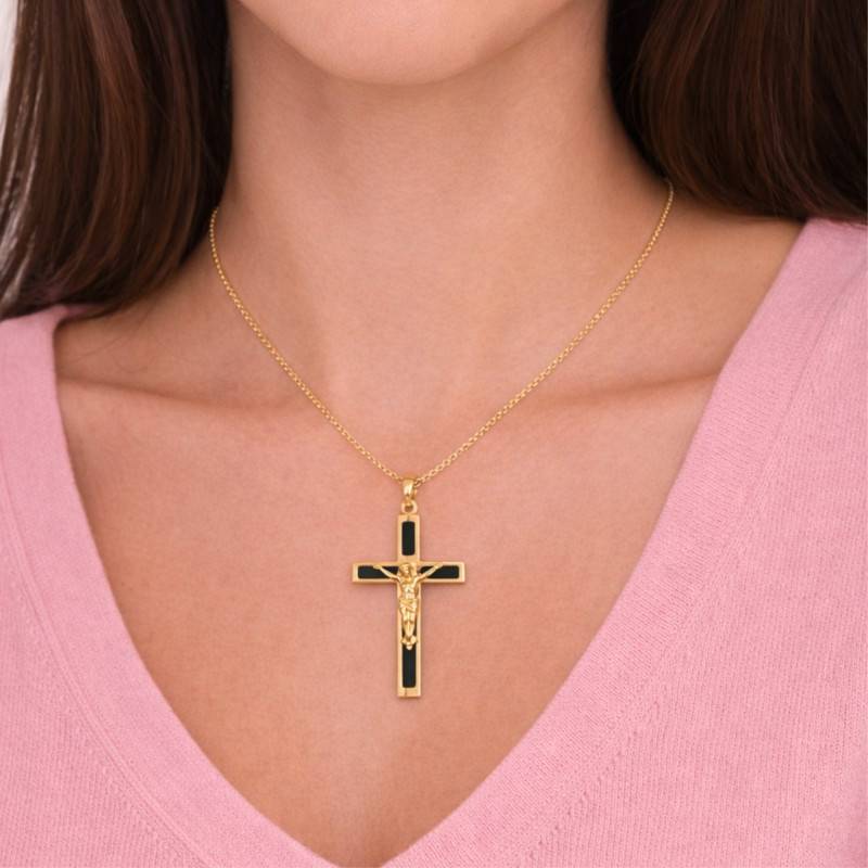 Sublimez votre style avec le Pendentif Croix Crucifix en Onyx et Or Jaune 375, un bijou à la symphonie de contrastes éclatants entre l'Or Jaune poli et l'intense noir de l'Onyx. Cette création aux dimensions précises de 21 mm de largeur et 41 mm de hauteur, pèse avec délicatesse 1,60 g, et est élaborée en Or 375/1000 (9K). Arborant des finitions polies et brillantes, elle s'impose comme l'emblème d'une élégance intemporelle.