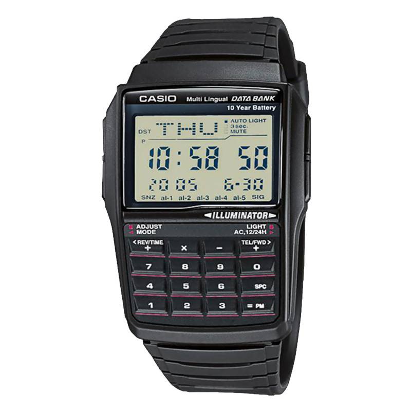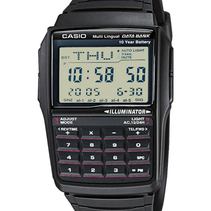 Cette montre multifonctions, avec un cadran à cristaux liquides mesure : 50,40 x 34,40, x 12 mm (HxLxE) présente un bracelet en acier et un boitier en résine noir. Elle possède les fonctions : Calculatrice, 5 alarmes multiples, bip horaire, fonction snooze, chronométrage au 1/100e de seconde, deuxième fuseau horaire, calendrier automatique, convertisseur de devises, affichage jour. Elle n'est pas étanche mais résiste à des projections d'eau, ainsi il faut éviter la douche ou la vaisselle.