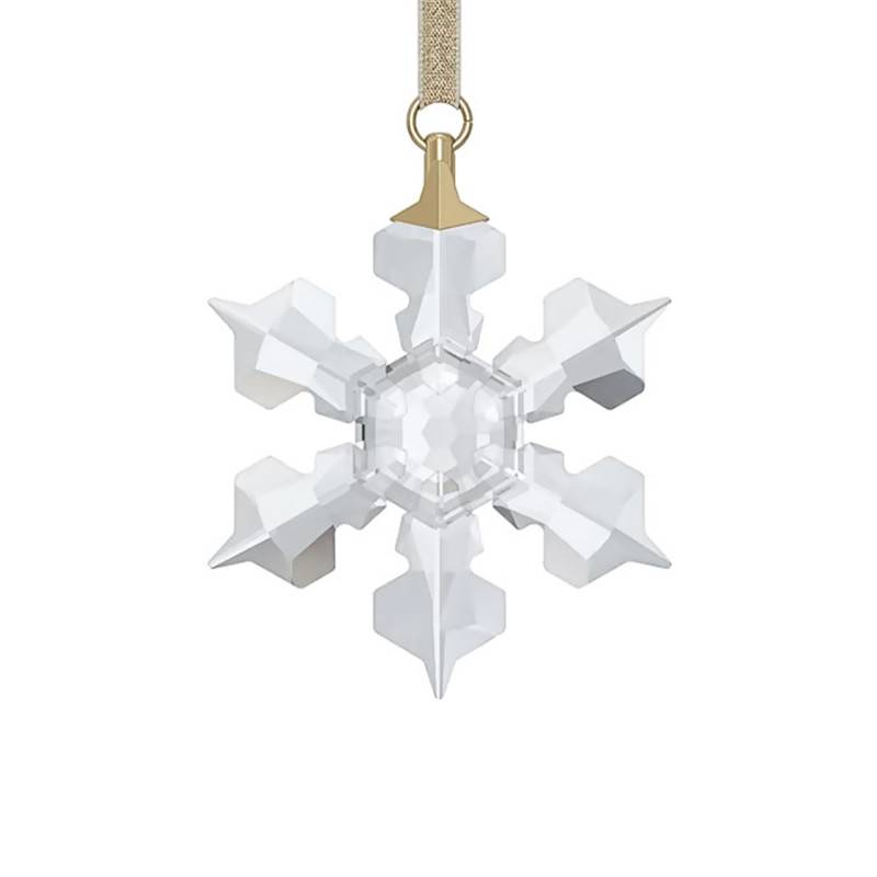 Découvrez cette belle œuvre décorative qui vous séduira par son design original et intemporel. Elle est en forme de flocon de neige et est attaché à un ruban en lamé doré, celui-ci présente 170 facettes de cristaux blancs qui feront étinceler de lumière vos décorations de Noël. Les dimensions de cette pièce sont : hauteur : 5.1 cm, largeur : 0,8 cm et longueur : 3,9 cm.