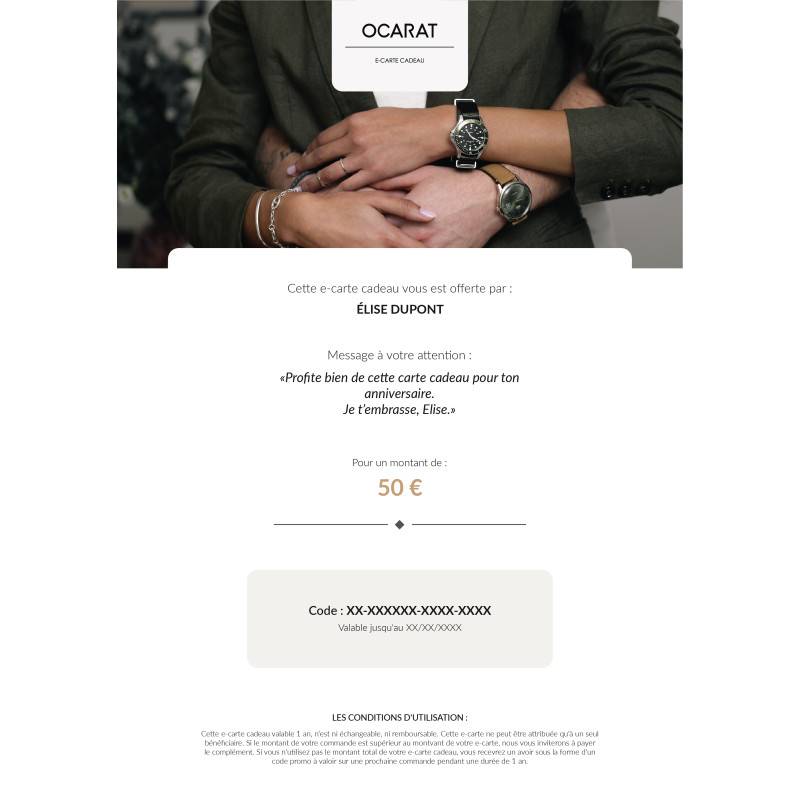 Difficile de faire un choix ou en manque d'inspiration ? Avec la e-carte cadeau Ocarat, offrez-lui la possibilité de craquer parmi une large sélection de montres, bijoux et accessoires.