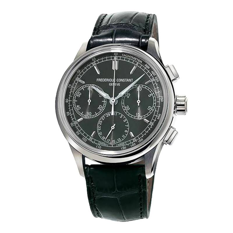 Présenté à Baselworld en mars 2017, ce modèle est une véritable révolution dans le monde de l'horlogerie et est déjà cité comme une référence en rapport de luxe accessible. Le rapport qualité/prix est en effet à couper le souffle, avec ce chronographe automatique Flyback au mouvement manufacture qui se place bien en deçà des 4000 euros. La maison Frédérique Constant continue alors sa mission ultime : proposer des modèles de montres aux finitions impeccables, offrir le luxe accessible aux férus d'horlogerie qualitative. La mission réussie aujourd'hui le passage d'un nouveau cap. La manufacture horlogère pleine d'ambition qui ne cède à aucun compromis et aucune pression de la part du marché. Le boitier de la montre est réalisé dans un qualitatif acier inoxydable, vous permettant d'être certain de la solidité de la montre et de sa capacité à vous suivre à travers les âges. Il offre un diamètre de 42 mm. Le verre qui vient se placer sur ce boitier est un verre saphir, auquel on reconnait depuis longtemps sa résistance face aux diverses rayures inesthétiques qui pourraient arriver dans la vie commune de tous les jours. Le fond de la boite est quant à lui transparent et vissé, permettant l'admiration du mécanisme en mouvement. Couronne et boutons poussoirs sont situés sur la droite du boite.