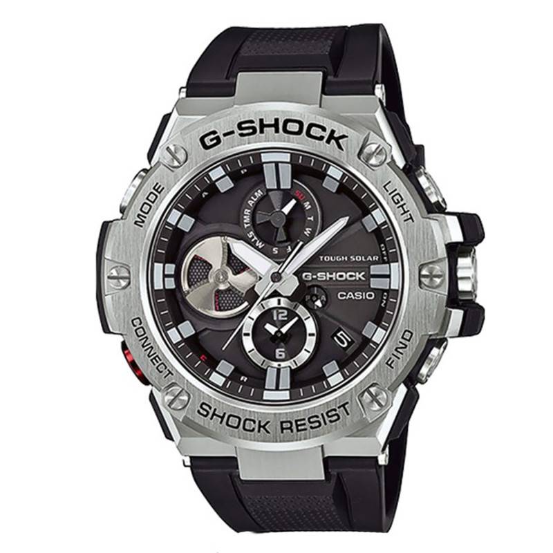 Pensé pour les amateurs des aventures sportives et de la technologie mobile avancée, voici un nouveau G-Steel Bluetooth de la collection à succès G-Shock, signé par la marque nippone Casio. Chic, fonctionnelle et solide en même temps, cette montre offre de nombreuses fonctions et une résistance aux chocs inégalée. Le boitier en acier fin aux finitions brossées et satinées et en résine apporte à cette montre la grande solidité dont nous traitions ci-avant. Le boitier mesure 53 mm de diamètre pour 14 mm d'épaisseur. Enfin, surmonté d'un verre minéral, ce boitier robuste possède un fond de boite maintenu par des vis.