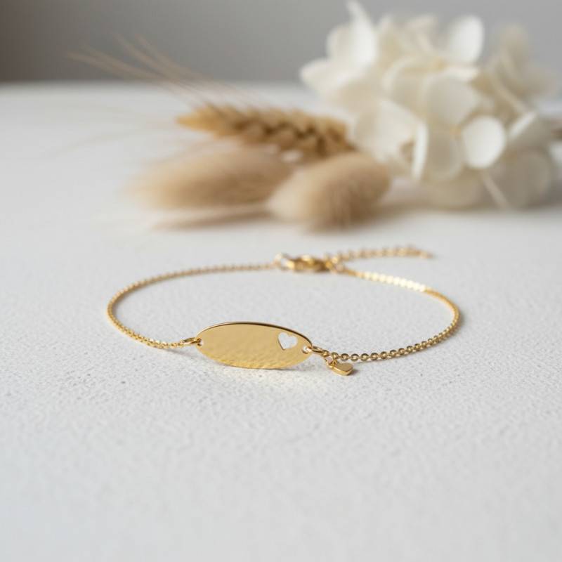 La plaque de la gourmette est de dimensions 9 x 22 mm. Celle-ci est décorée d'un motif ajouré en forme de cœur qui se marie à la perfection avec le charm's du bracelet. La longueur du bijou est de 14 cm avec un anneau de réglage à 12 cm. La chaine présente une largeur de 1.3mm. Le poids moyen de la gourmette est de 1,20 gramme.