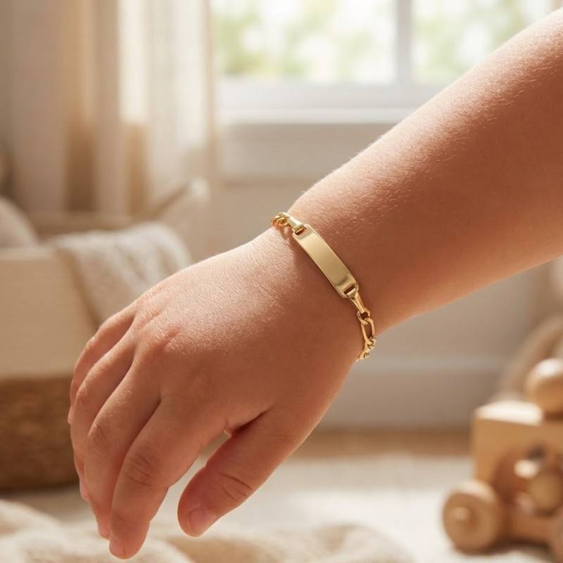 Cette charmante gourmette or pour enfant en or jaune 375/1000 (9K) de la marque Bambins est une gourmette plaque de forme rectangulaire qui a pour dimensions 25 x 4 mm.