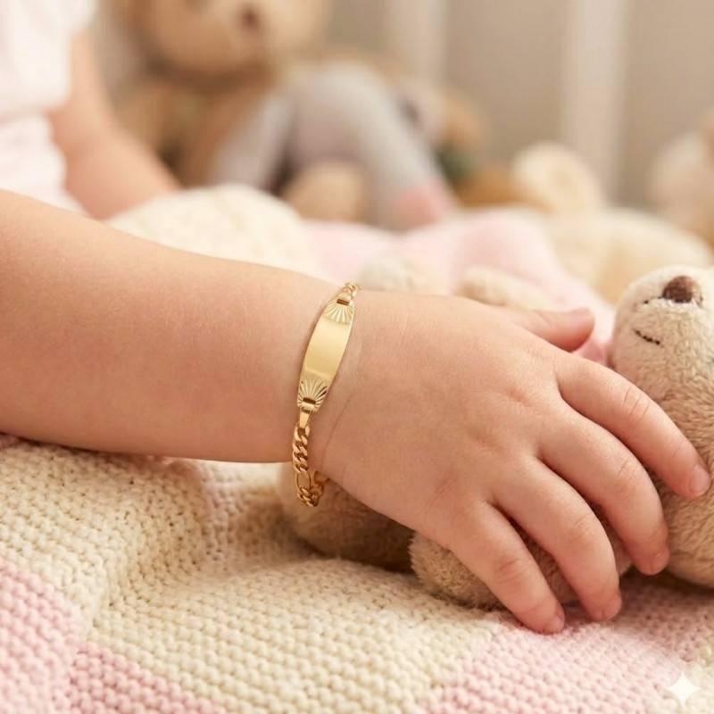 Cette Gourmette Ovale Maille Figaro en or jaune 375/1000 (9K) se distingue par sa plaque ornée d'un élégant motif soleil en relief. Ce bijou présente des dimensions harmonieuses avec une longueur de 14 cm, ajustable à 12 cm grâce à son anneau souple, et une largeur de 2,60 mm. D'un poids de 1,60 gramme pour un porté quotidien tout en confort, l'ensemble est sécurisé par un fermoir de type anneau à ressort.