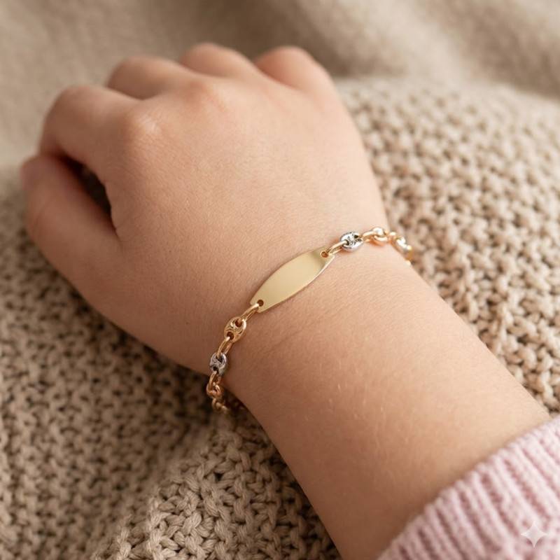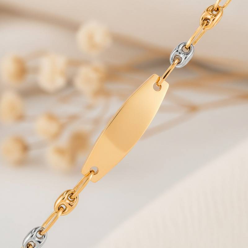 Cette gourmette grain de café 3 ors de la marque Bambins séduit par son élégance intemporelle et son jeu de couleurs subtil. Confectionné en or blanc, jaune et rose 375/1000 (9K), ce bijou de 14 cm de long arbore une maille grain de café de 3,12 mm de largeur associée à une plaque centrale ovale de 21 x 6 mm. Entièrement personnalisable par une gravure de votre choix, cette pièce s'adapte à tous les poignets grâce à ses multiples anneaux de réglage, offrant ainsi un cadeau de naissance ou de baptême aussi prestigieux que durable.