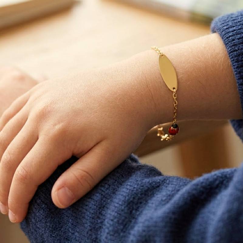 Cette Gourmette Plaque Ovale Coccinelle en Or Jaune 375, est spécialement conçue pour les enfants avec une maille forçat délicate et un fermoir de type anneau à ressort. Fabriqué en or jaune 9K pour un poids total de 0,85 g, ce bijou arbore une finition polie et brillante qui capte magnifiquement la lumière. Sa longueur ajustable de 12 à 14 cm permet d'accompagner la croissance de l'enfant tout en garantissant un confort optimal au quotidien.