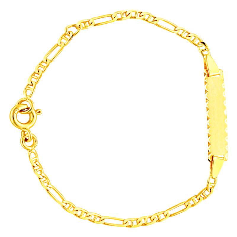 Cette élégante gourmette au design moderne se distingue par sa maille marine alternée triple et sa plaque centrale rectangulaire aux bords travaillés, offrant un rendu à la fois singulier et contemporain. Confectionné en or 750/1000 (18K) pour un poids d'or moyen de 2,10 grammes, ce bijou arbore une finition polie et brillante qui capte magnifiquement la lumière. Ce modèle est doté d'une longueur ajustable de 14 cm, réglable à 12 cm, assurant un confort parfait au poignet de l'enfant pour une naissance ou un baptême.