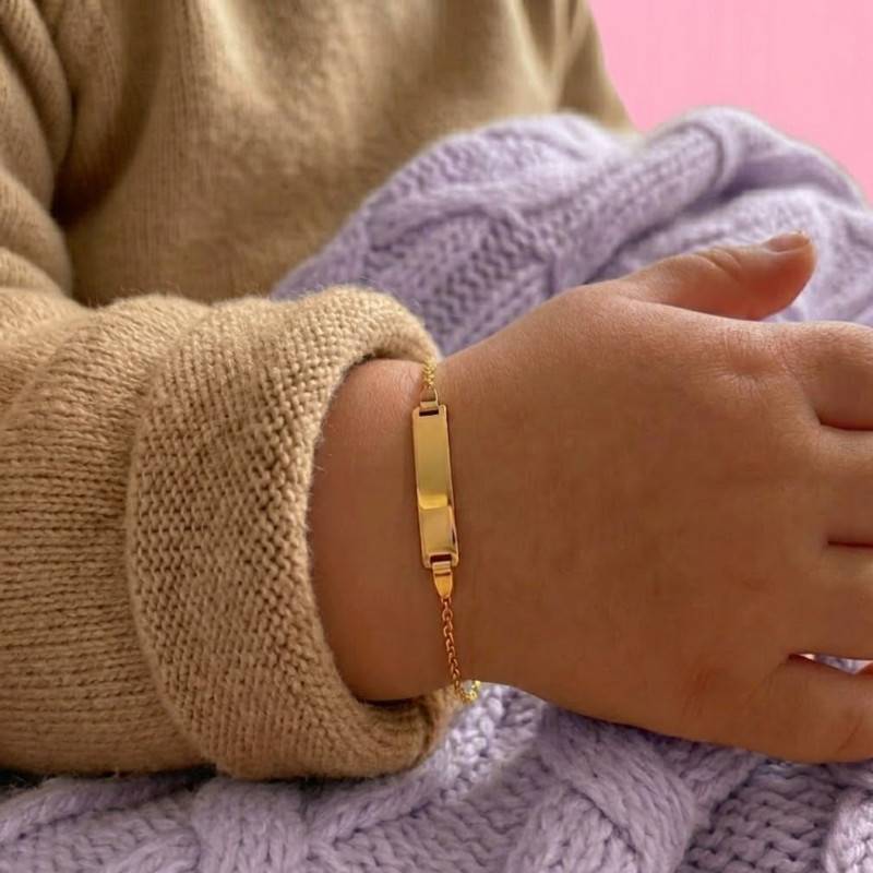 Nous avons choisi pour vous cette ravissante gourmette en or jaune qui parera joliment le poignet de votre bébé. Elle peut également être un beau cadeau de naissance ou d'anniversaire. Adorable, elle comporte une chaîne forçat et une plaque rectangulaire polie qui ajoute un éclat raffiné au bracelet. Ce bracelet dispose de deux anneaux vous permettant d'ajuster sa longueur de 12 cm à 14 cm ou bien de 14 cm à 16 cm de longueur. Il se termine avec un fermoir anneau à ressort qui vous permet de l'ajuster facilement. Cette gourmette est fabriquée en or jaune de qualité 750/1000 (18K) avec un poids d'or moyen de 1,20 gramme. Notez que la plaque mesure 2,20 cm de longueur et 0,40 cm de largeur.