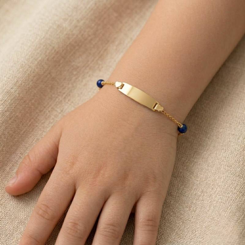 Cette charmante gourmette identité en est la preuve. Destinée aux bébés, elle est fabriquée en or jaune 375/1000 (9K) et se pare d'une plaque tonneau ornée de coeurs. De ton doré, celle-ci est maintenue par une chaîne en maille forçat qui est sublimée par 5 billes bleues en lapis-lazuli. Cette combinaison de couleur apportera une note charmante à votre enfant. Ce bracelet est muni d'une chaînette d'extension et d'un fermoir anneau à ressort qui vous permettront de l'ajuster en longueur de 12 cm à 14 cm et de 14 cm à 16 cm. Il a un poids d'or de 1,25 gramme.