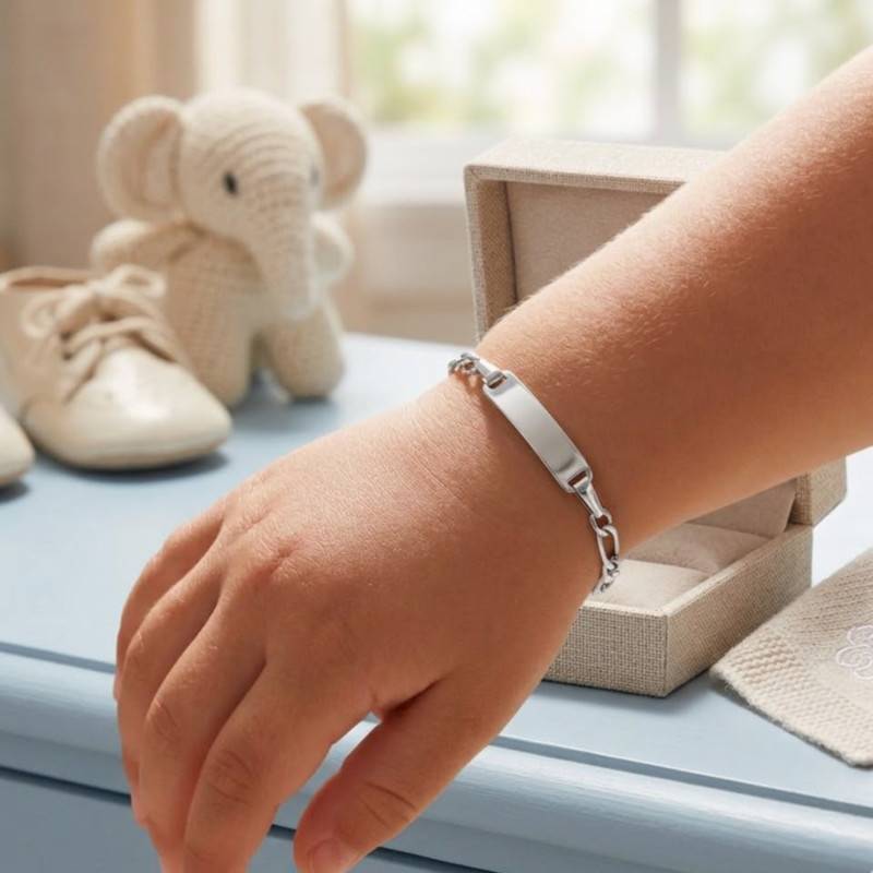 Cette ravissante gourmette enfant de la marque Bambins se distingue par son élégante structure en or blanc 375/1000 (9K) rhodié, rehaussée d'une maille cheval alternée triple. Sa plaque rectangulaire offre un espace privilégié pour une personnalisation sur mesure, tandis que ses anneaux de réglage permettent d'ajuster la longueur de 10 à 15 cm pour accompagner l'enfant au fil des années.