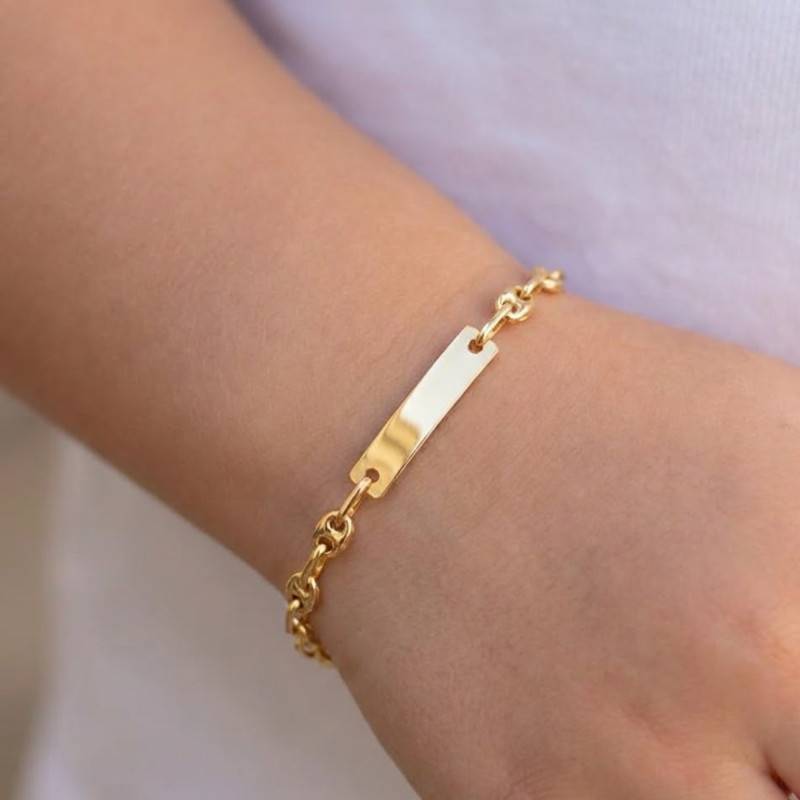 Exquise et ravissante, découvrez cette gourmette en or jaune 375/1000 (9K) pour enfant de la marque Bambins. La chaîne est en maille grain de café et a une largeur de 3 mm. La gourmette a en son centre une plaque rectangulaire de dimensions 20 x 4 mm, et mesure 14 cm de longueur.