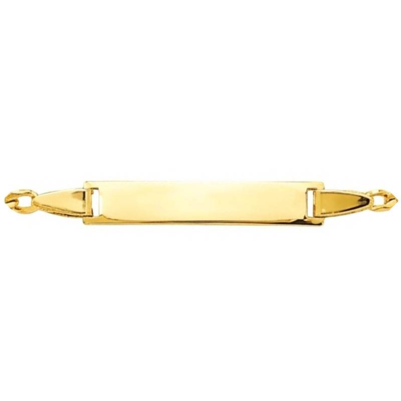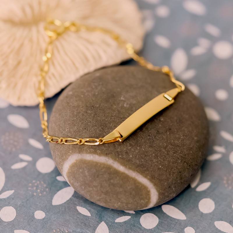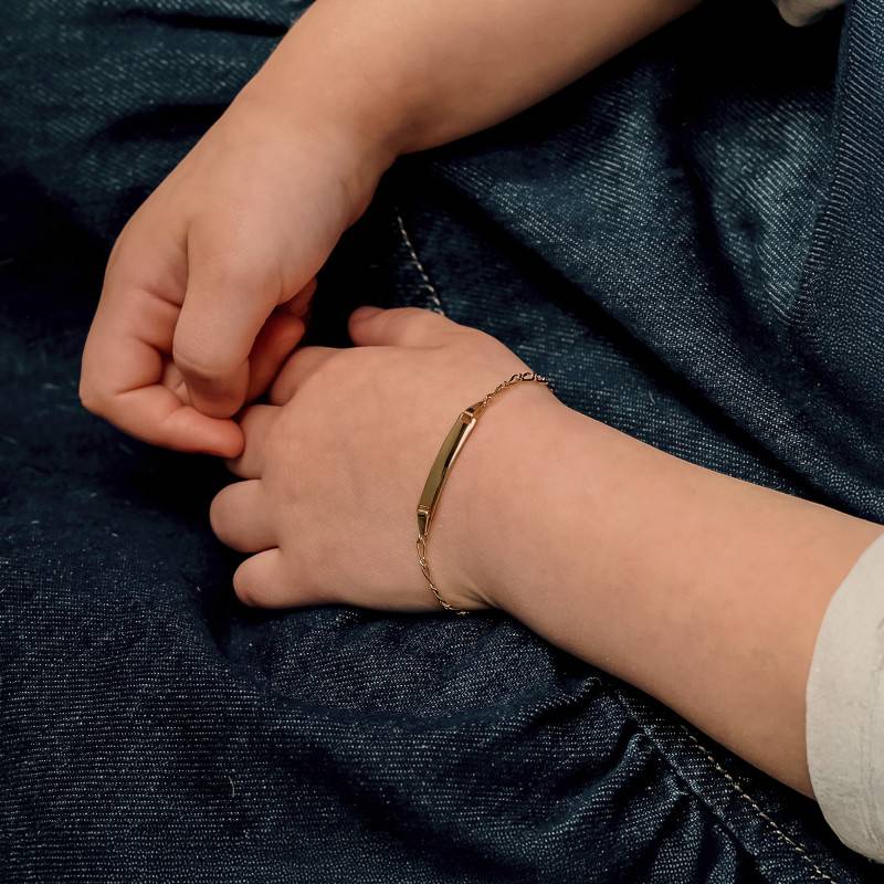 Cette gourmette Bambins en or jaune se distingue par sa maille cheval alternée, offrant un rendu à la fois moderne et intemporel au poignet des tout-petits. Le bijou arbore une finition polie et brillante qui capte magnifiquement la lumière, mettant en valeur sa plaque rectangulaire de 4 x 18 mm. D'une longueur de 14 cm, ajustable à 12 cm grâce à son anneau de réglage, elle s'adapte parfaitement à la croissance de l'enfant et s'attache en toute sécurité avec son fermoir anneau ressort. Ce modèle, disponible en or 375/1000 (9K) ou 750/1000 (18K), peut être rendu unique grâce à une gravure personnalisée réalisée avec soin par notre artisan.