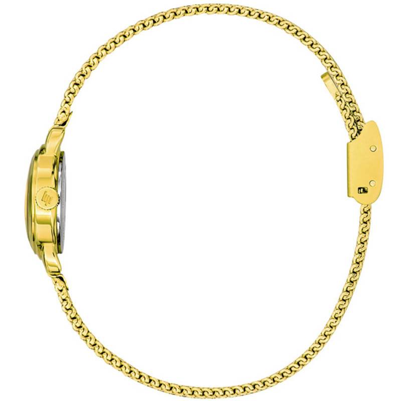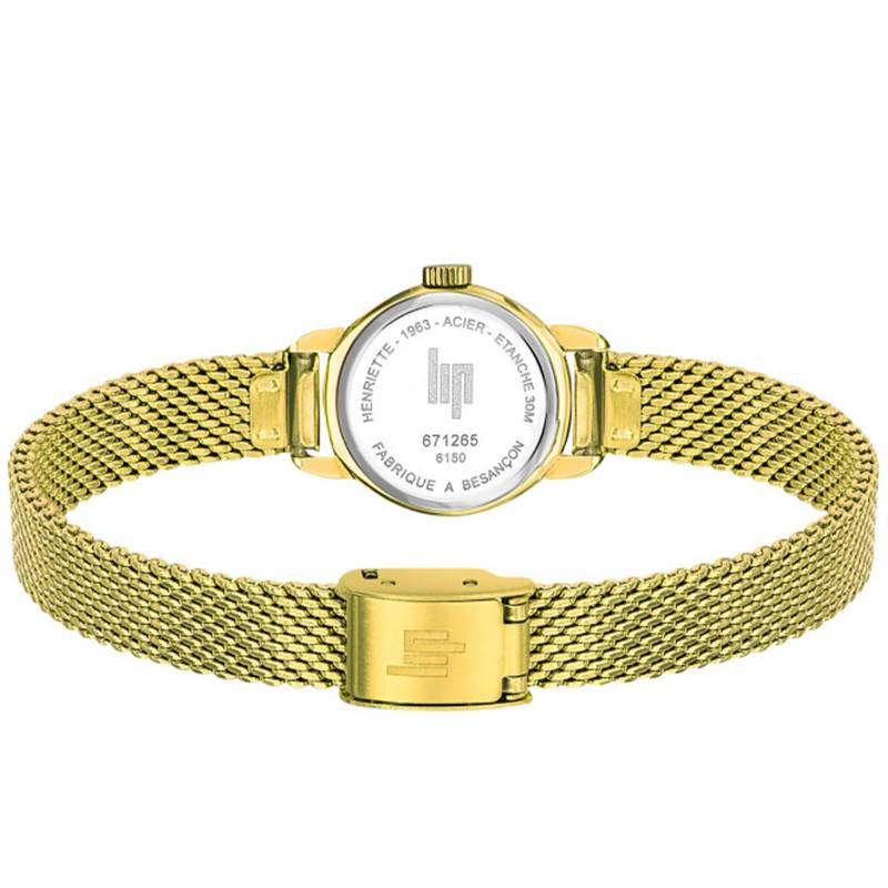 Merveilleuse montre qui possède un boîtier de forme ronde de 18.5 mm de diamètre en acier doré dans la masse et poli. Le cadran possède douze index de couleur or jaune en chiffres arabes (3h, 6h, 9h et 12h), les autres sont de forme triangulaire. Les deux aiguilles des heures et minutes sont dorées. Le logo Lip est également présent sur le cadran à 12h00. Elle est équipée d'un bracelet en acier inoxydable recouvert de PVD or jaune à maille milanaise de 8 mm d'entrecorne.