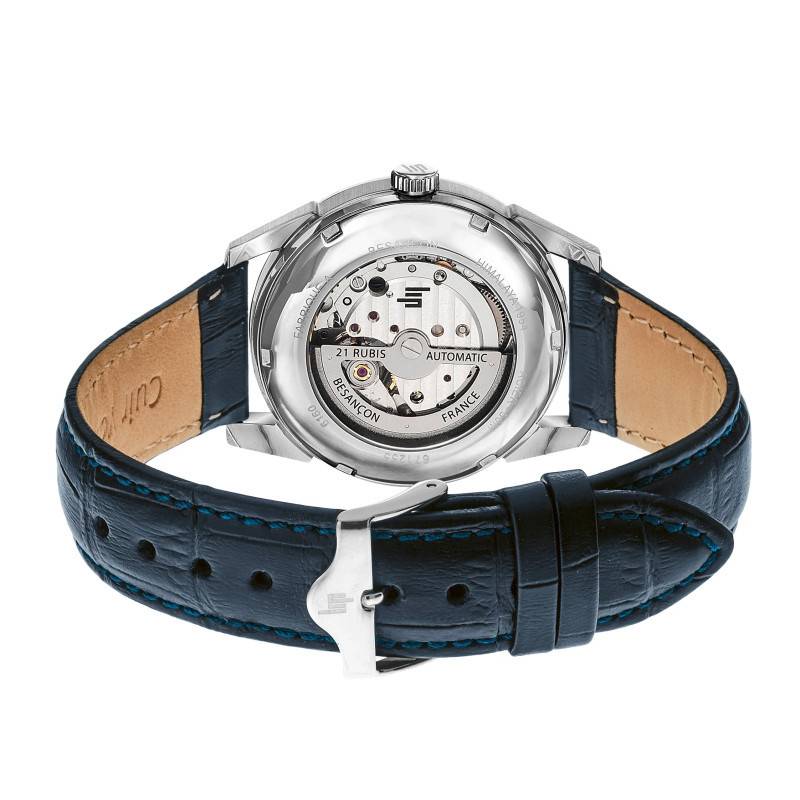 Le cadran blanc dévoile un index triangulaire chromé tout comme les deux aiguilles bleues (heures et minutes) et les chiffres arabes 3, 9 et 12. Le compteur petites secondes est présent à 4h, il dévoile une aiguille bleue en adéquation avec le bracelet en cuir bleu nuit. Le cœur ouvert est visible à 7h, il permet de contempler le mécanisme automatique de la montre. L'inscription « Besançon France », la marque et la collection sont inscrites sur le cadran respectivement à 6h et 12h.