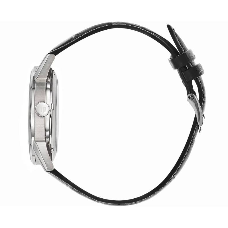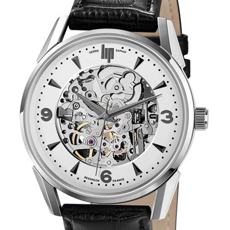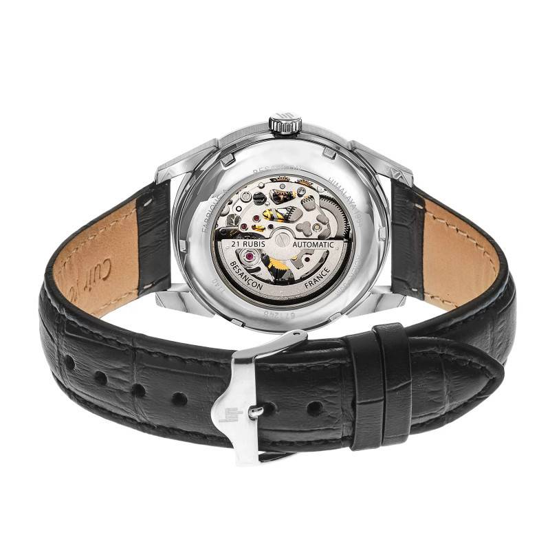 Les aiguilles sont chromées et indiquent les heures, les minutes et les secondes. Un chemin de fer en point est de couleur noir. Le logo de la maison est inscrit à la place des 12h. Le certificat Besançon France est écrit entre les 6h. La couronne est située à 3h vous permettant de régler l'heure. Le verre est un verre saphir. Le bracelet de 20 mm est en cuir de couleur noir aux finitions crocodile, avec boucle ardillon.