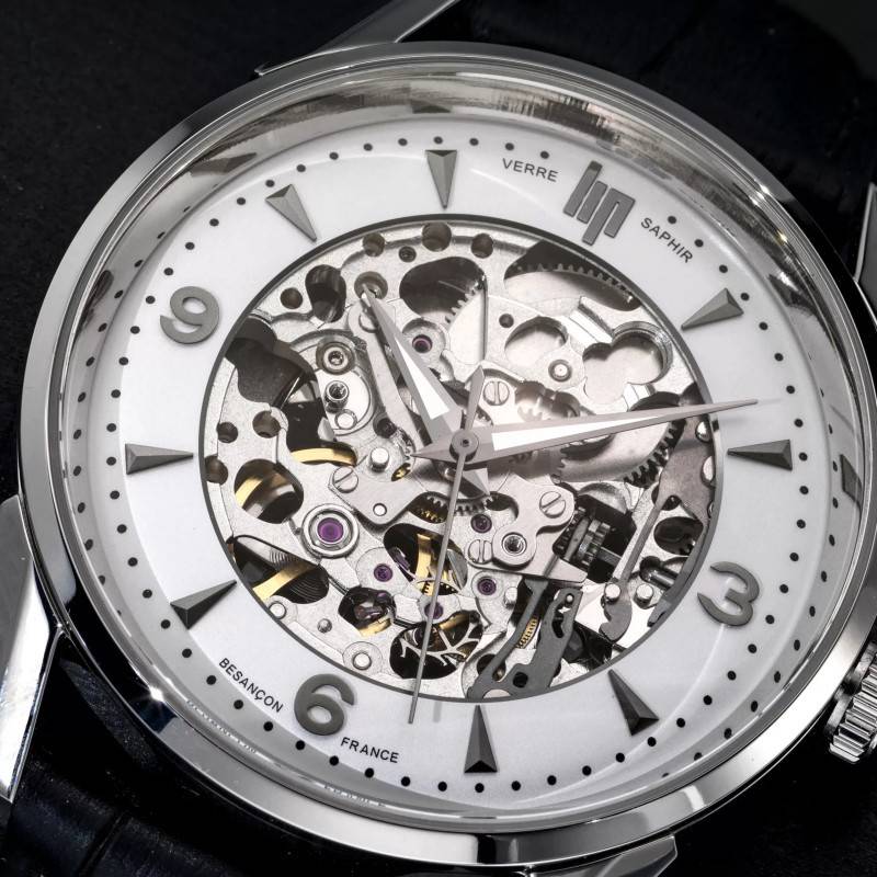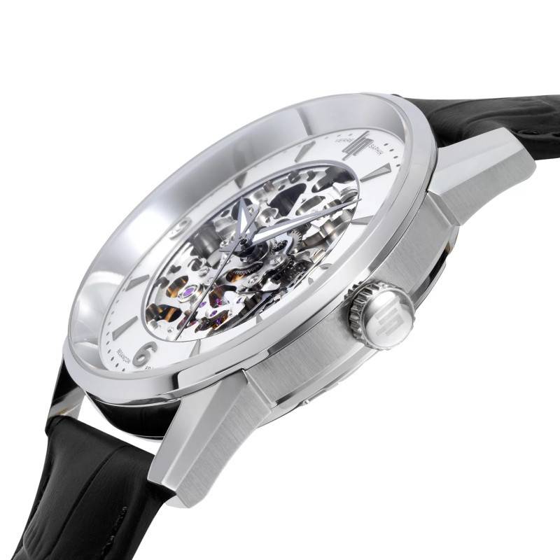 Le boitier est en acier chromé poli mesurant 40 mm de diamètre. Le cadran argenté dispose d'index triangulaires chromés en relief accompagnés des points cardinaux en chiffres arabes à 3h, 6h et 9h. Au centre de ce cadran, voyez le squelette de la montre.