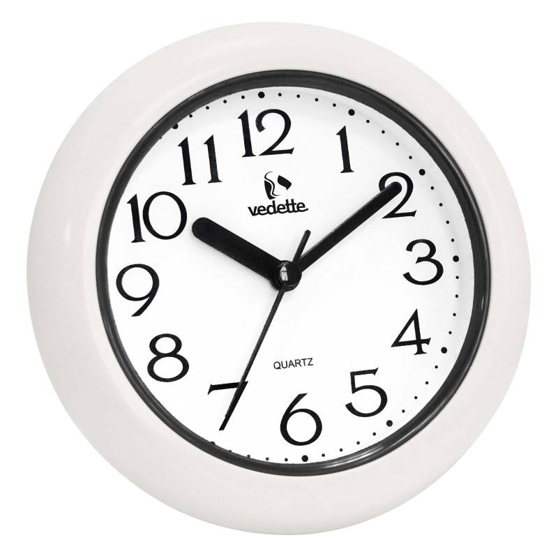 Découvrez cette petite horloge VP40014 de la maison horlogère Vedette. Son boîtier blanc en plastique et son cadran de couleur blanche lui donne un rendu passe-partout qui s'intégrera facilement dans tous vos espaces. Ce modèle est particulièrement conçu pour les pièces humides. En effet, son mécanisme est protégé par un boîtier rond de 17 centimètres de diamètre, étanche avec un joint, idéal pour la salle de bain ou la cuisine ! Vous pourrez y lire l'heure en toute simplicité grâce à un affichage analogique et un chemin de fer des minutes parsemé par les index des heures plus épais. Ces derniers sont accompagnés des chiffres arabes des heures correspondantes. Les aiguilles des heures et des minutes sont de couleur noire et font ressortir la trotteuse rouge. A midi, vous retrouverez la signature de la marque en plus d'une écriture noire à 6 heures précisant le mouvement quartz de ce modèle. Une pile est fournie avec l'horloge.