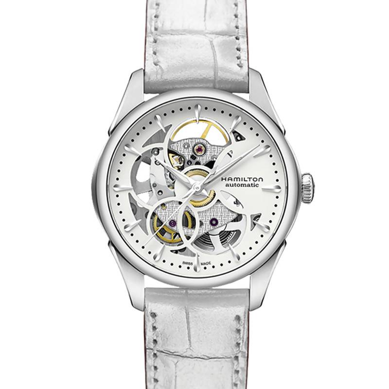 Après avoir gâté la gente masculine avec de splendides modèles munis de cadrans aux finitions squelettes, Hamilton souhaite offrir aux femmes qui aiment la mécanique horlogère et les belles pièces une gamme de garde-temps similaire à celle des hommes, mais retravaillée pour des poignets fins et élégants avec des couleurs féminines. En effet, elles offrent d'admirer le mécanisme en fonctionnement, entrainant le course du temps dans un véritable ballet d'engrenages dansants. Le mouvement au sein du boitier est de fabrication suisse, donnant à la montre une très grande fiabilité en plus d'un style rétro-vintage bien propre à la maison Hamilton. Le boitier de forme ronde (36 mm diamètre) est en acier inoxydable 316L. Ce boitier est surmonté d'un verre saphir inrayable. Le fond de boite est maintenu par 4 vis et transparent pour permettre d'admirer la masse oscillante en mouvement. La couronne est située à 3h.